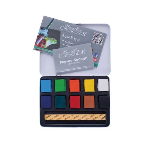 This Cretacolor Aqua Brique Set contains: White, Yellow, Orange, Red, Blue, Dark Blue, Green, Dark Green, Brown, Black + 1 sponge