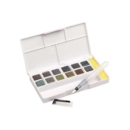 The Derwent Graphitint Paint Pan Set contains 12 Graphitint paint pans, a mini waterbrush, a sponge and five mixing palettes. It is ideal for travel and plein air painting. The colours in the set are: