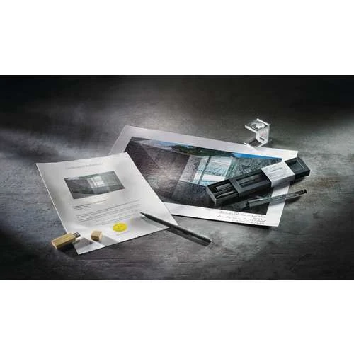 The black archival and waterproof fineliner with pure pigment ink is document-proof, lightfast and odourless. It has a fine metal tip and makes even the most detailed signatures possible. The classic graphite pencil is also in black with archive quality.