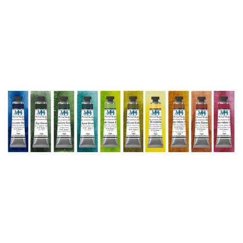 - 67660 = Botanical set – 10 tubes in: Phthalocyanine Blue Lake, Sap Green, Hookers Green, Aqua Green, Bright Green Lake, Green Gold, Yellow Benzimidazolone, Quinacridone Gold, Burnt Sienna, Quinacridone Rose