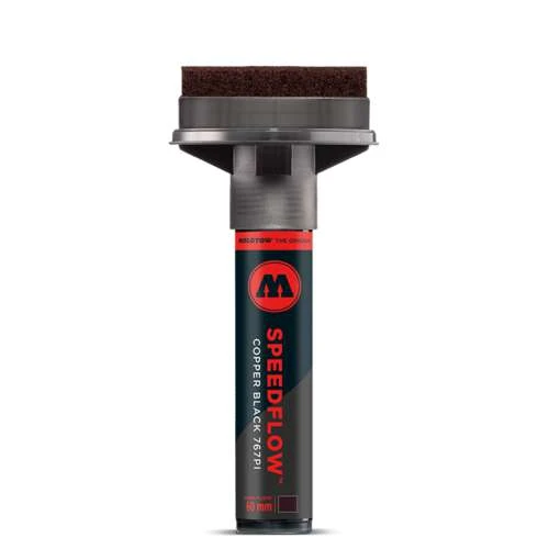 These Molotow Masterpiece SpeedFlow Markers have replaceable 60mm highflow tips and patented capillary technology which ensures constant colour flow. They are refillable. They contain nitrogen based cocktail ink which produces a viscoplastic black coating with a slight copper shimmer.
