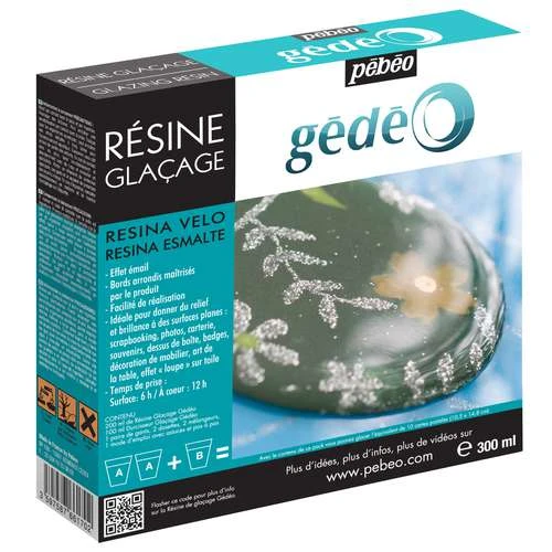 The Pébéo Gédéo Glazing Resin Set contains 300ml of easy-to-use transparent resin. The 2-part epoxy resin creates hard, glass-like surfaces with rounded edges.