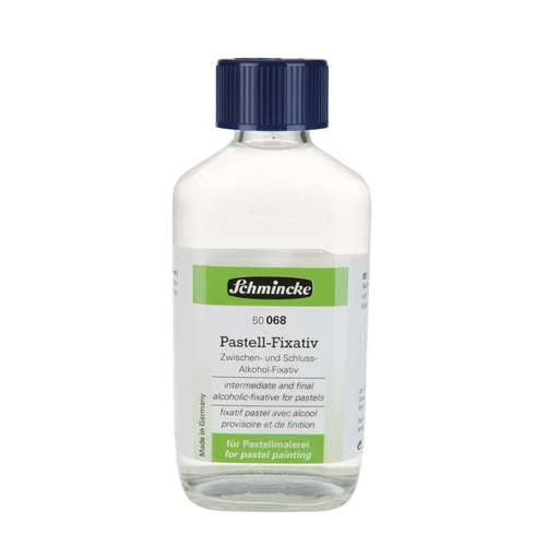 Schmincke fixative, transparent, alcohol-based, and with very little altering effect on paints.